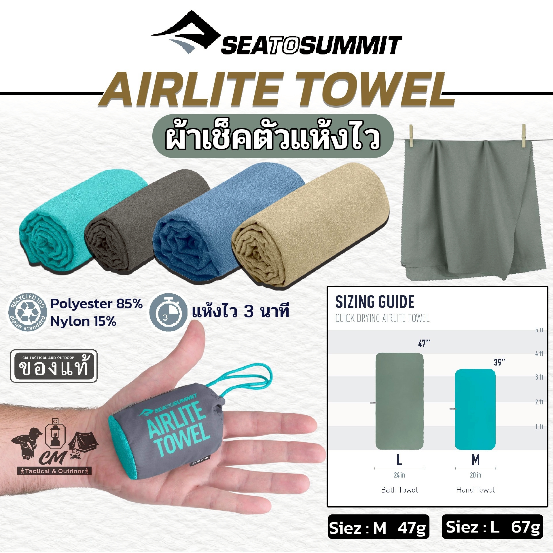 🔹ผ้าเช็ดตัวที่บางและเบาที่สุดของ Sea To Summit คือรุ่น Airlite Towel น้ำหนักเบากว่า Pocket Towel ถึง 50% ผลิตจากเส้นใยไมโครไฟเบอร์ที่ดูดซับน้ำได้ดีและแห้งเร็วมากแค่แขวนไว้บนกระเป๋าขณะเดิน ใช้เวลาไม่นาน ซักง่าย ม้วนเก็บลงเป้ได้ง่ายไม่เปลืองเนื้อที่ ตัดขอบด้วยเลเซอร์ บรรจุในถุงเล็กกะทัดรัดสีสดเพื่อมองเห็นได้ชัด สำหรับพกพาเดินป่า ท่องเที่ยวหรือผู้ที่ต้องการลดน้ำหนักและเพิ่มพื้นที่ของเป้