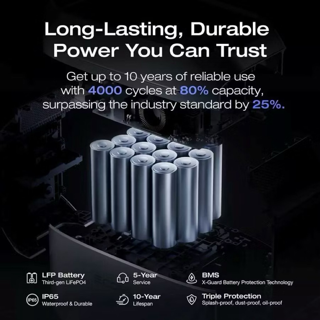 🔹 ชนิดแบตเตอรี่ LFP (LiFePO4) อายุการใช้งานแบตเตอรี่ 4,000 รอบการชาร์จ เหลือความจุ 80% ขึ้นไป
