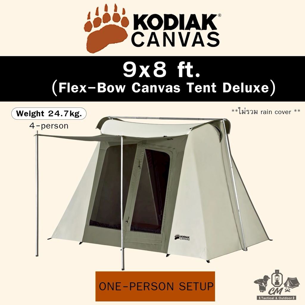 • Hydra-ShieldTM, 100% Cotton Duck Canvas. Durable, watertight and breathable. • Flex-Bow Frame: Exceptionally sturdy. Keeps tent taut. Quick and easy, one-person, setup. • Spacious 6'1" ceiling height provides walk-around comfort. • Two large D-shaped doors (front and back) with #10 YKK zippers. • Four large windows with no-see-um mesh. • Front Awning (70x57 inches) provides covered entry and shade. • Customizable organizer pockets (1 pocket organizer, 1 bag organizer, 2 sewn in pockets) • Designed for compact storage. • Two funnel-flow vents help improve air flow and temperature management. • Stainless steel, wire stake loops. • Heavy-duty 12-inch, steel rod, stakes. • Zippered storage bag.